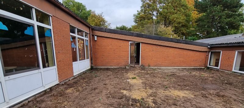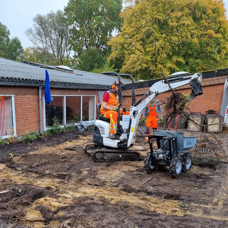 Was passiert denn da im Innenhof der Schule neben der Aula? Das fragten sich die Schüler und Lehrkräfte nach den Herbstferien. Plötzlich sind die Hochbeete weg und auch die Wege sind verschwunden. Da sind ja auch gar keine Büsche mehr.